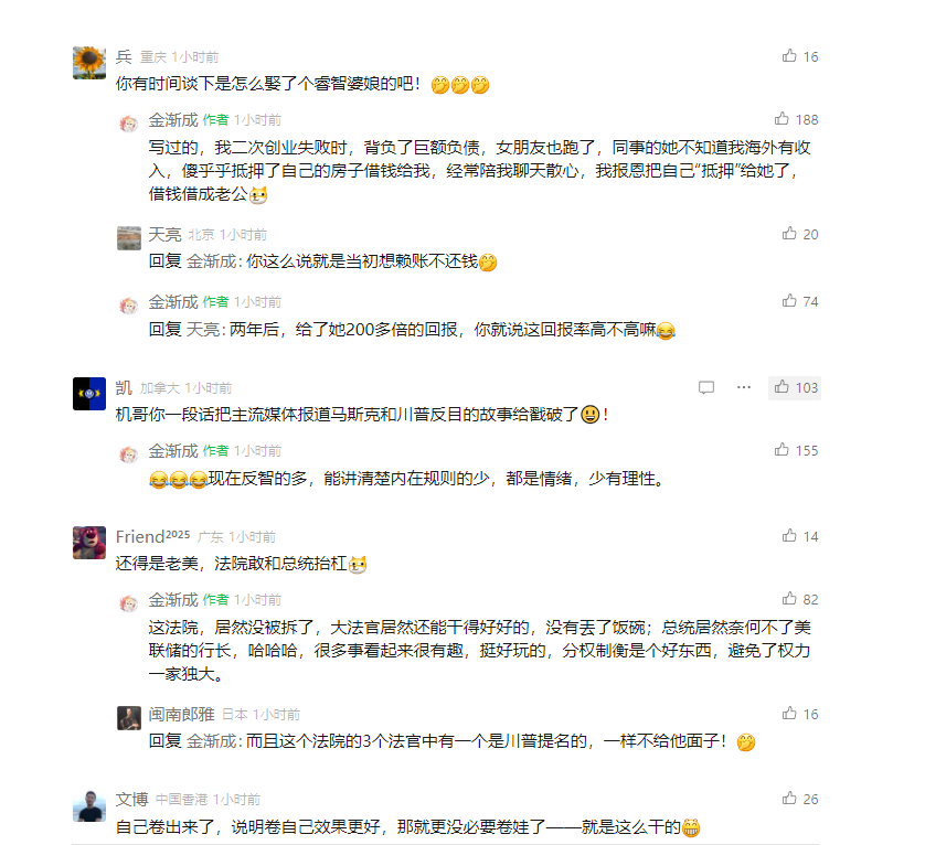 金渐成(作者):这法院,居然没被拆了,大法官居然还能干得好好的,没有丟了饭碗;总统居然奈何不了美联储的行长,哈哈哈,很多事看起来很有趣,挺好玩的,分权制衡是个好东西,避免了权力一家独大。